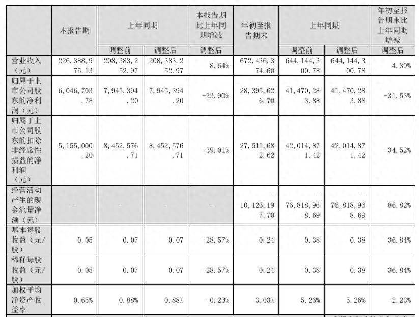 其中第三季度,公司营业收入为2.26亿元,同比上升8.6%;归母净利润为605万元,同比下降23.9%;扣非归母净利润为516万元,同比下降39.0%;EPS为0.0509元。