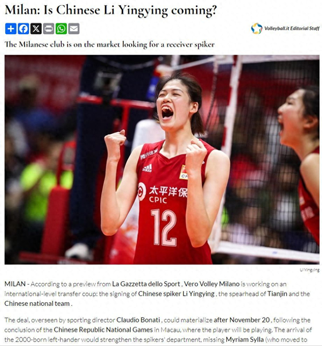 报道中还提到,米兰希望通过引进李盈莹来加强自己的4号位主攻实力,并进一步挑战科内利亚诺队的霸主地位。也就是说,李盈莹如能成功留洋,那么她将成为米兰争冠最后拼图。虽然前几个赛季,李盈莹一直被传留洋海外,但均未能成行,很多人都担心这次又是一个“狼来了”的故事。